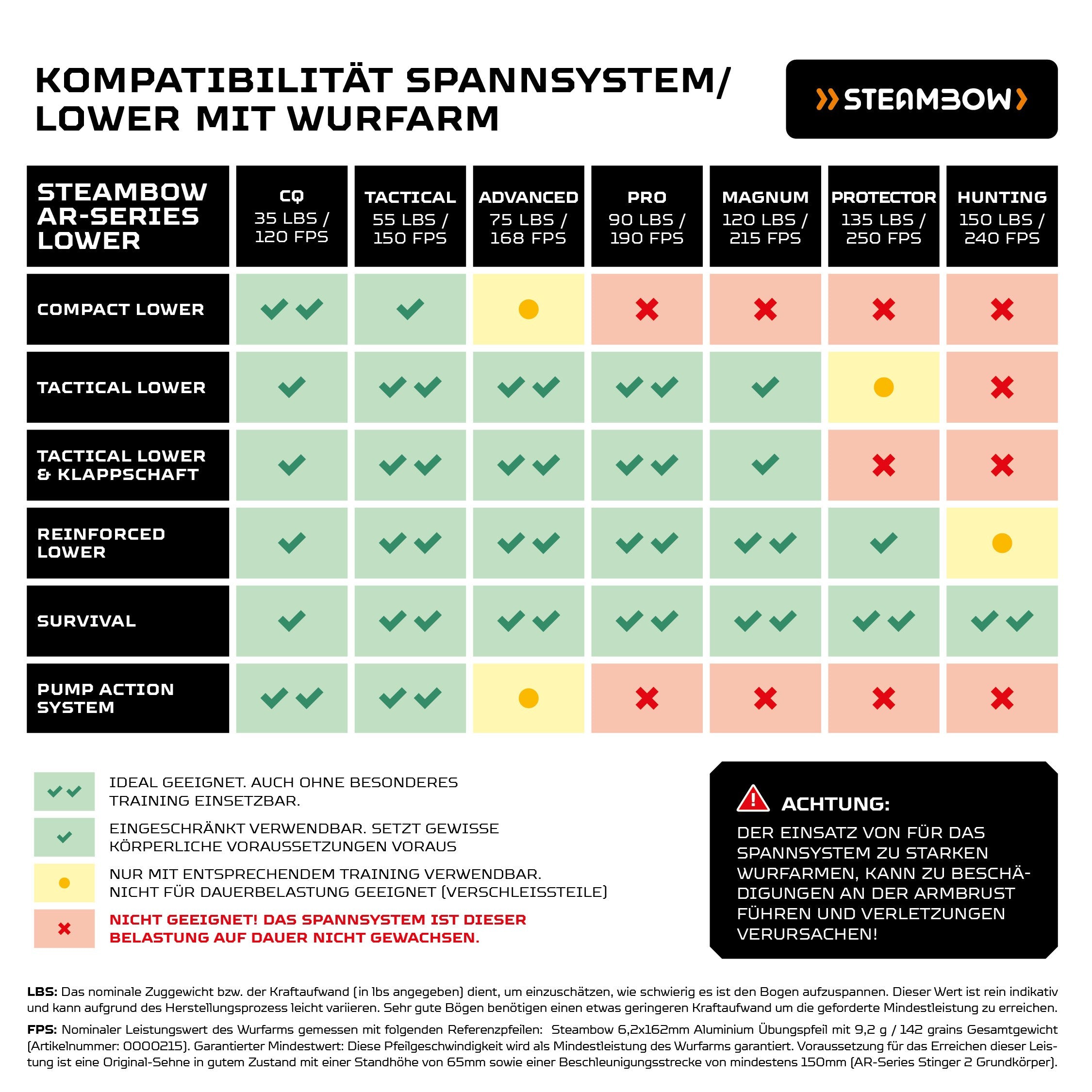 * Garantiertes FPS-Rating des Wurfarms, gemessen mit folgendem Referenzpfeil: Steambow 6,2 x 162 mm Aluminium Übungspfeil mit 9,2 g / 142 grains Gesamtgewicht (Artikelnummer: 0000215). Voraussetzung für das Erreichen dieser Leistung ist eine Original-Sehne in gutem Zustand mit einer Standhöhe von 65 mm, sowie eine Beschleunigungsstrecke von mindestens 150 mm (AR-Series Stinger II Grundkörper).