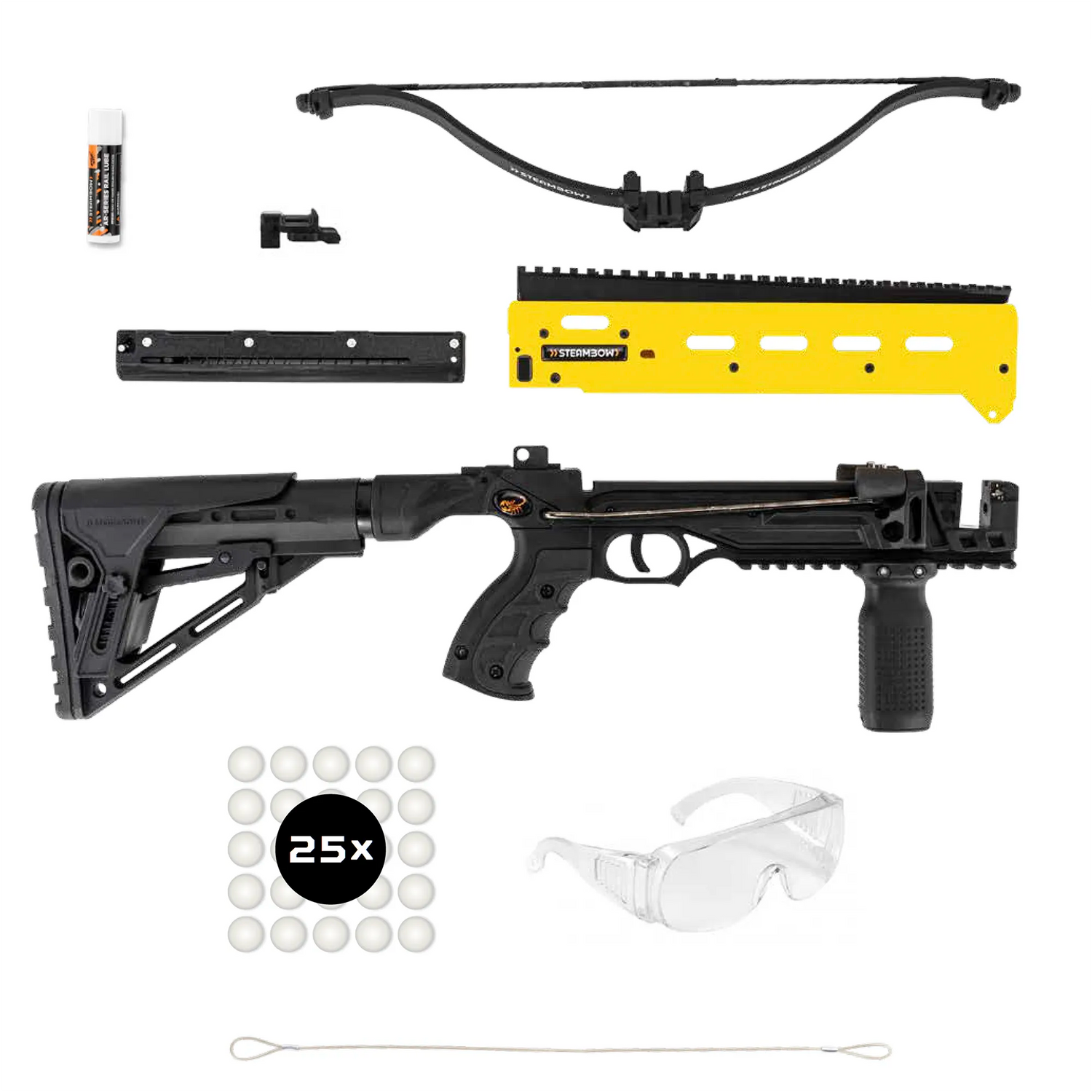 Achtung: Die B08 ist ausschließlich mit reizstoffgefüllten Kugeln, sog. PepperBalls™, „Less than Lethal“, also mit größter Wahrscheinlichkeit nicht tödlich. Mit harten oder schweren Kugeln ist die Armbrust potenziell tödlich und muss auch als solche behandelt werden.