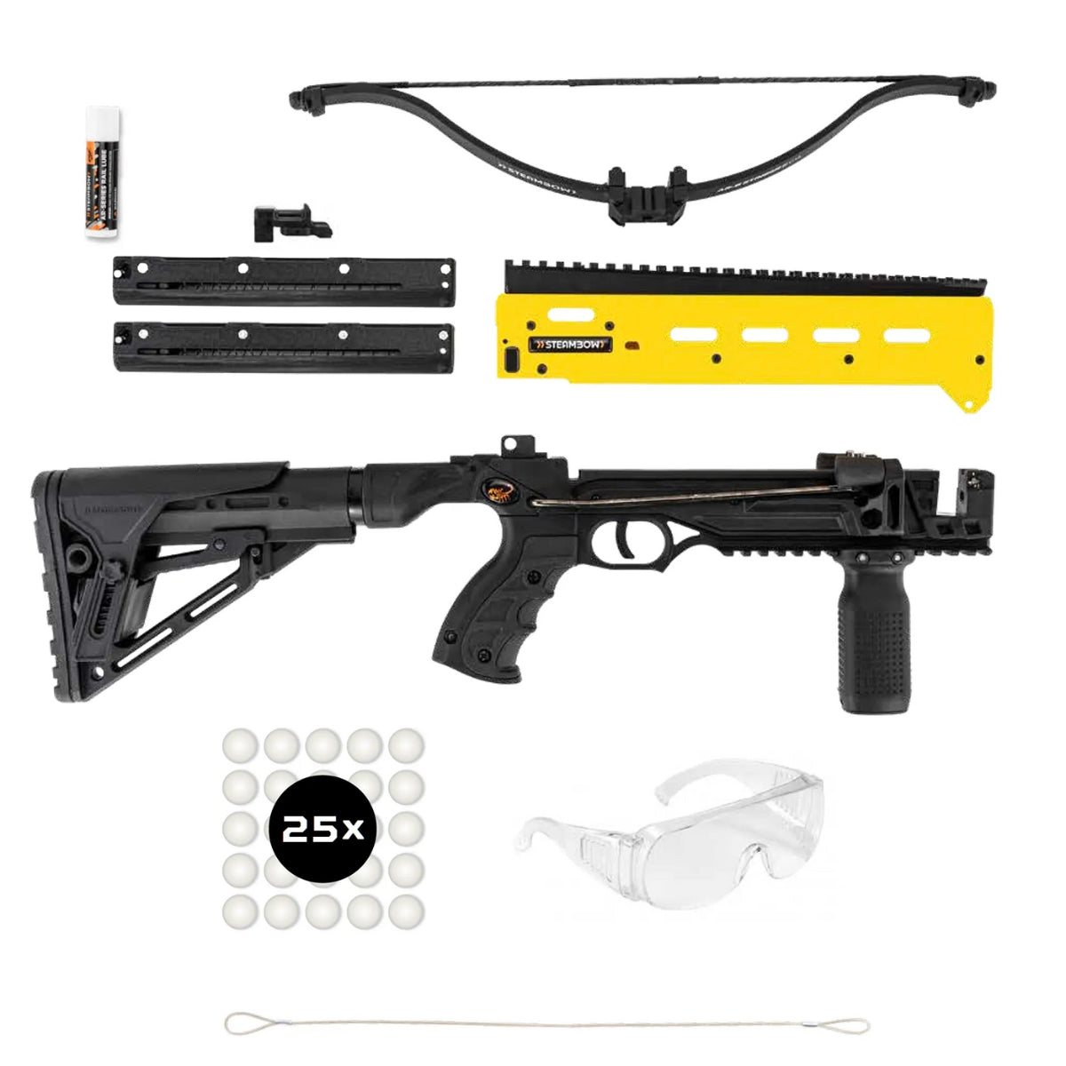 Achtung: Die B08 ist ausschließlich mit reizstoffgefüllten Kugeln, sog. PepperBalls™, „Less than Lethal“, also mit größter Wahrscheinlichkeit nicht tödlich. Mit harten oder schweren Kugeln ist die Armbrust potenziell tödlich und muss auch als solche behandelt werden.